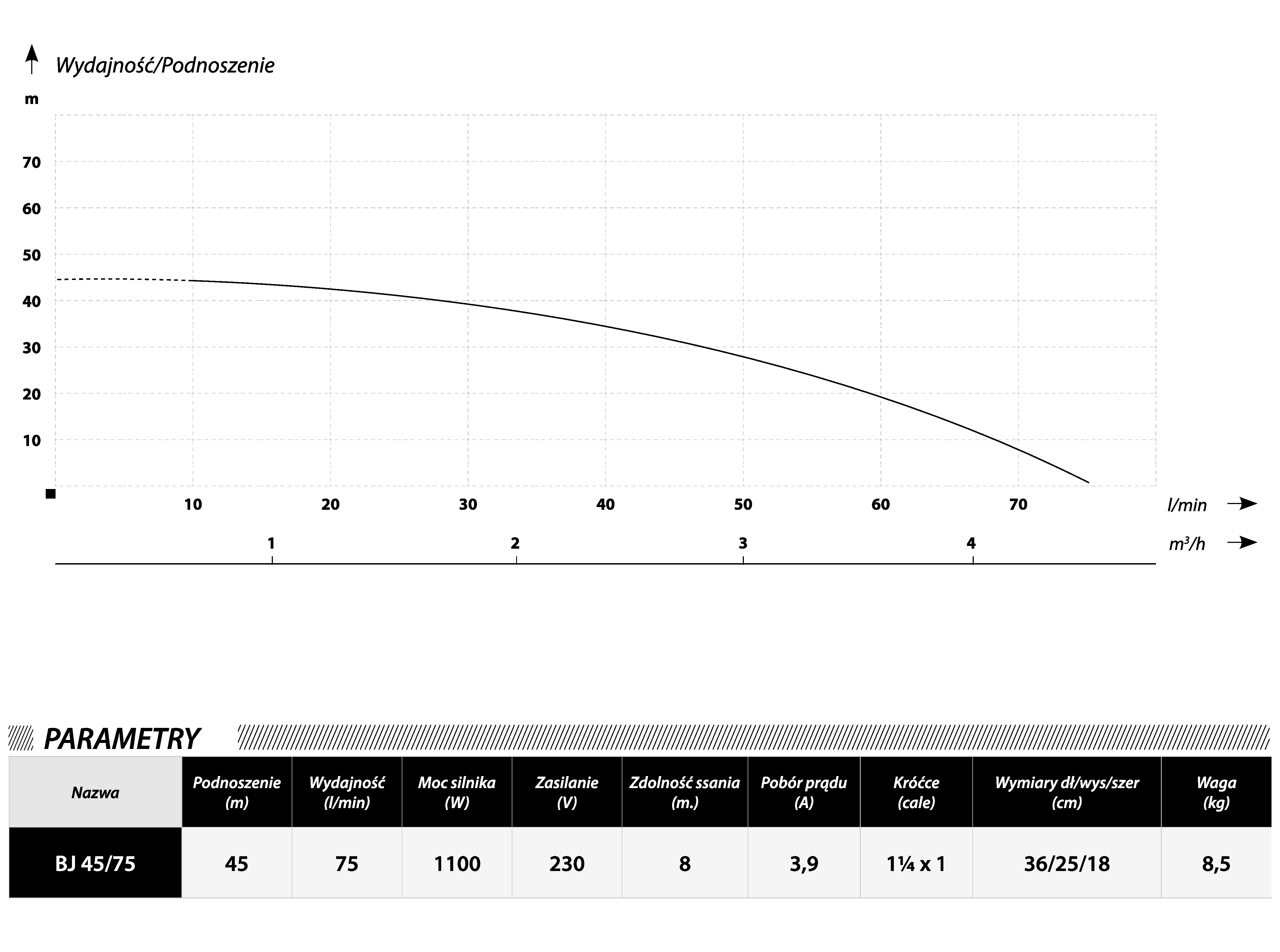 Pompa przeznaczona do pompowania czystej, zimnej wody z własnych ujęć oraz podnoszenia ciśnienia. BJ 45/75 jest jednostopniową, samossącą, odśrodkową pompą powierzchniową, wyposażoną w układ podnoszący zdolność ssania dzięki zastosowaniu tuby Venturiego. Korpus i wał pompy w części mającej kontakt z wodą zostały wykonane ze stali nierdzewnej (INOX). Pompa wytwarzana jest w najwyższych standardach jakościowych, co dotyczy użytych materiałów jak i wykonania. Pompa wyposażona została w przewód zasilający zakończony wtyczką a silnik pompy posiada wbudowane zabezpieczenie termiczne.