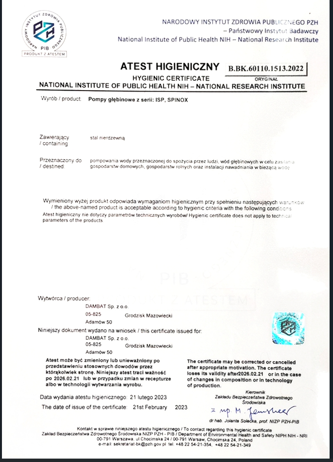 - Korpus ssący/tłoczny: stal nierdzewna AISI 304