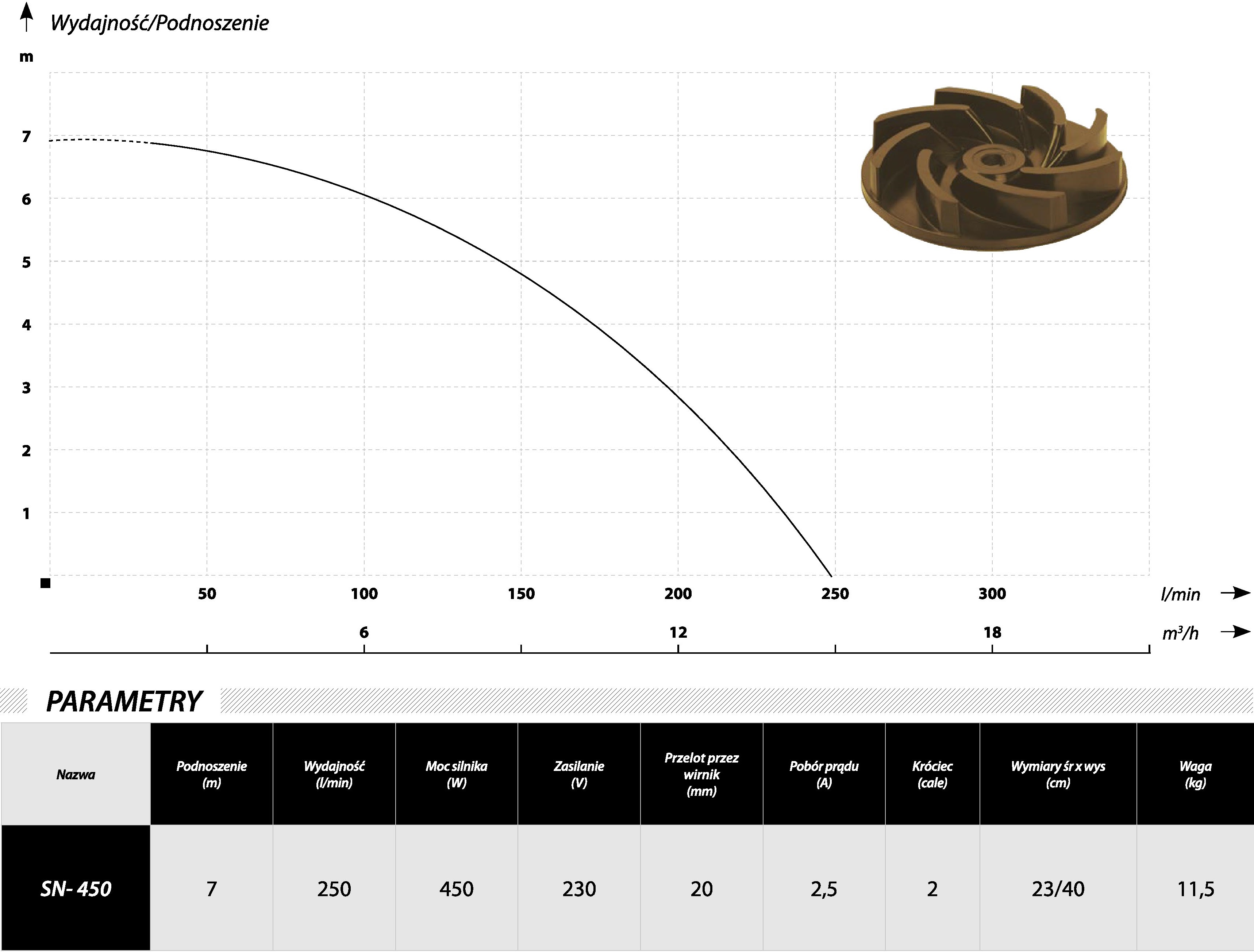Seria pomp zatapialnych przeznaczonych do przepompowywania ścieków, brudnej wody oraz wody z zalanych pomieszczeń. Pompa SN-450 wykonała została z żeliwa wraz z wirnikiem typu VORTEX. Może przepompowywać wodę zawierającą zanieczyszczenia mechaniczne o średnicy do 20 mm. Pompa wyposażona jest w słupkowy wyłącznik pływakowy, który umożliwia bezproblemową, automatyczną pracę urządzenia w studzienkach o średnicy już od 25 cm. Pompa SN-450 wyposażona została w zabezpieczenie termiczne montowane w uzwojeniu silnika.