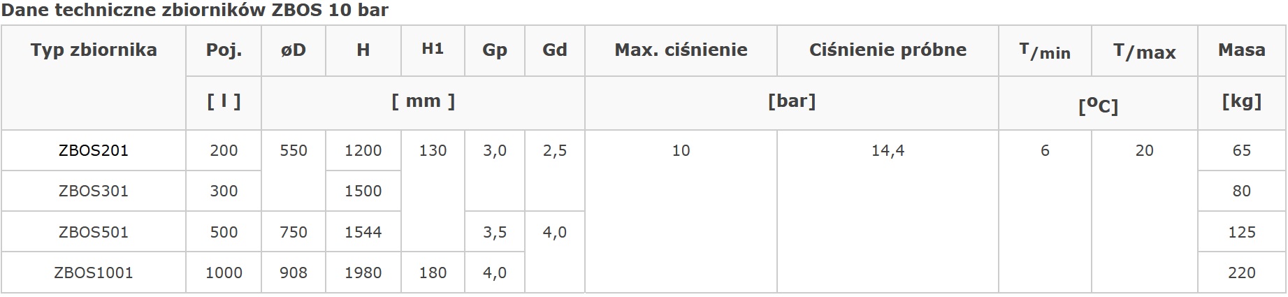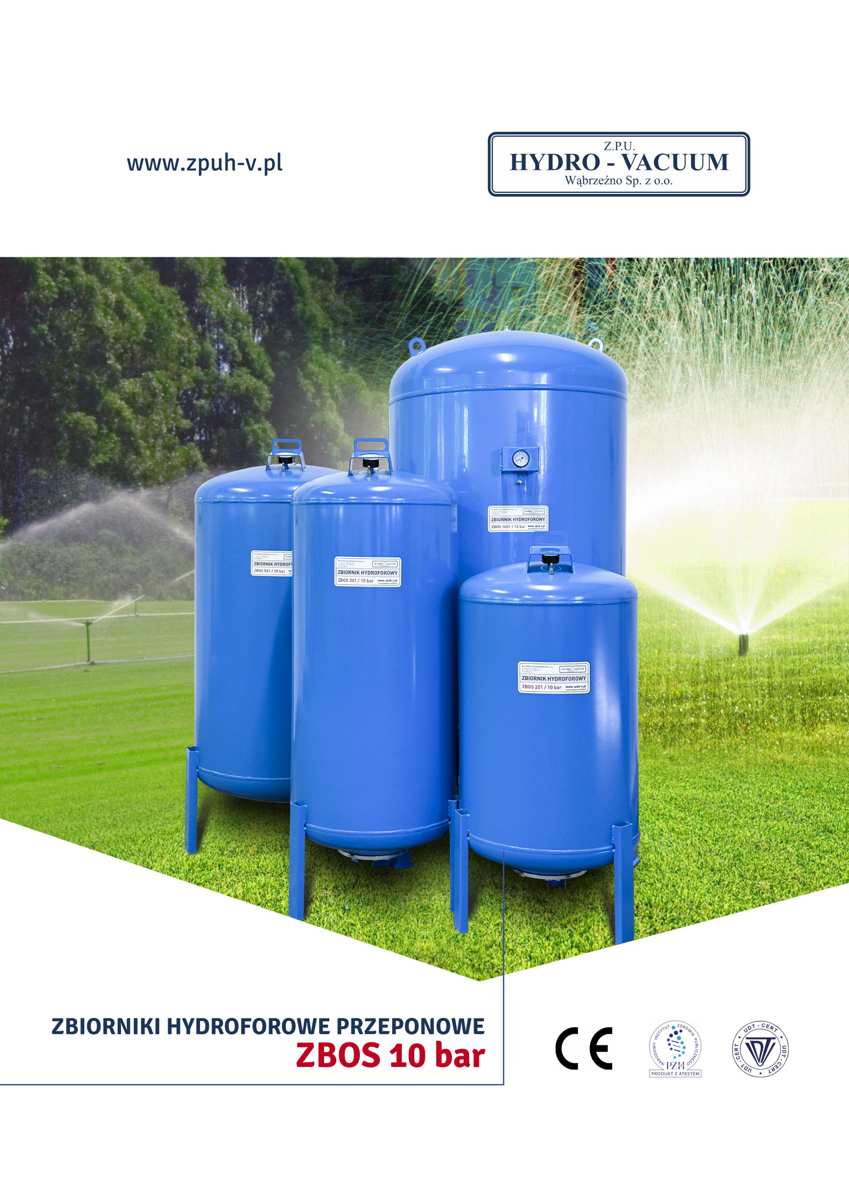 Zbiorniki hydroforowe przeponowe typu ZBOS 10 bar przeznaczone są do magazynowania wody użytkowej wykorzystywanej do zasilania w wodę budynków mieszkalnych i gospodarczych z własnego ujęcia do celów spożywczych lub przemysłowych. W połączeniu z pompami samozasysającymi lub głębinowymi tworzą automaty hydroforowe. Wewnątrz zbiornika znajduje się membrana workowa z gumy EPDM. Zbiorniki zabezpieczone są przed korozją powłoką malarską, zewnątrz i wewnątrz pomalowane są proszkowo. Ponieważ po przez membranę elastyczną został rozdzielony układ wodno-gazowy nie ma potrzeby ciągłego uzupełniania powietrza w czasie eksploatacji. na górnej dennicy znajduje się manometr, wentyl oraz uchwyt umożliwiający swobodne ustawienie zbiornika.